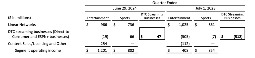 [1] DTC streaming businesses operating income (loss) is not a financial measure defined by GAAP. The most comparable GAAP measures are segment operating income for the Entertainment segment and the Sports segment. See the discussion under “Non-GAAP Financial Measure” for how we define and calculate this measure and a reconciliation of it to the most directly comparable GAAP measures.